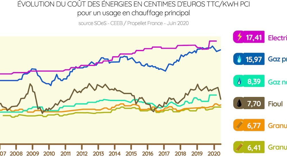 Nous avons assisté à une baisse significative du prix du fioul lors du premier semestre de 2020. Cela s’explique en grande partie par la chute de la demande mondiale liée à la crise sanitaire. Le prix du fioul (7,7 cts d’€ par KWh) n’est pas pour autant passé sous le prix du granulé (6,77 pour le sac et 6,41 pour le vrac). Le granulé de bois reste compétitif.
